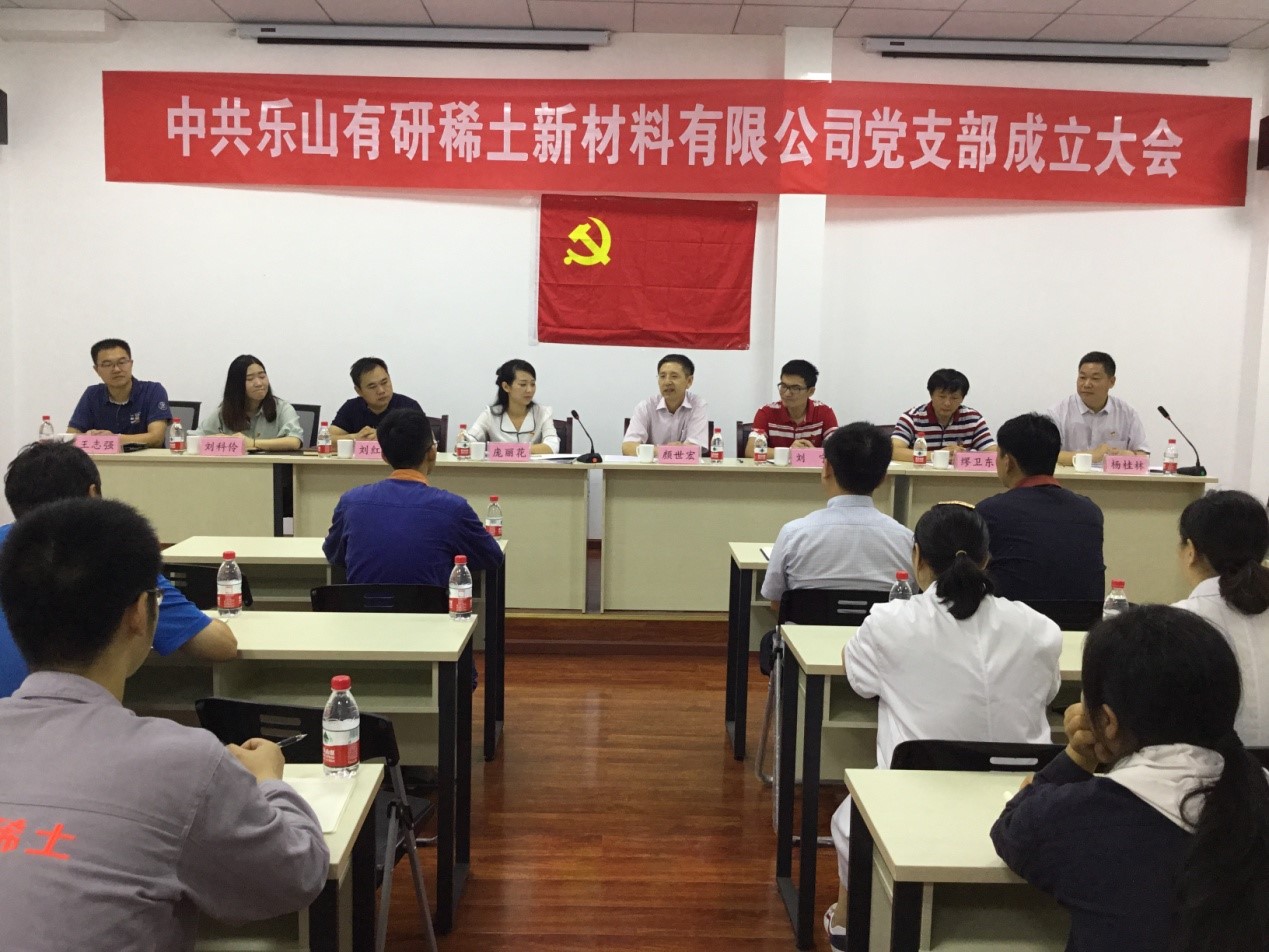 2018年7月27日上午9点,在庄严的国歌声中,中共乐山有研稀土新材料有限公司党支部成立大会隆重召开。峨边县委组织部、“两新”组织党工委副书记庞丽花及园区党工委刘红果、刘科伶,有研稀土党支部书记、常务副总经理颜世宏,365在线体育投注官网,beat365在线体育综合管理部副部长刘宁,365在线体育投注官网,beat365在线体育纪检办公室主任缪卫东,有研稀土生产总调室主任王志强及乐山有研全体党员、入党积极分子共30余人出席了大会,共同见证了这一重要历史时刻。会议由乐山有研总经理杨桂林同志主持。