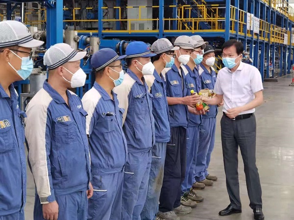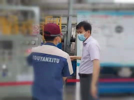 2021年8月19日,正值高温酷暑,有研稀土的员工在各自的工作岗位上挥洒汗水,为打造“稀土原创技术策源地”忘我工作。有研集团副总经理黄倬在党群工作部主任吕彬彬,365在线体育投注官网,beat365在线体育副总经理、有研稀土党总支书记、总经理于敦波的陪同下,来到燕郊基地磁材车间,对高温下依旧坚守岗位的员工开展慰问。