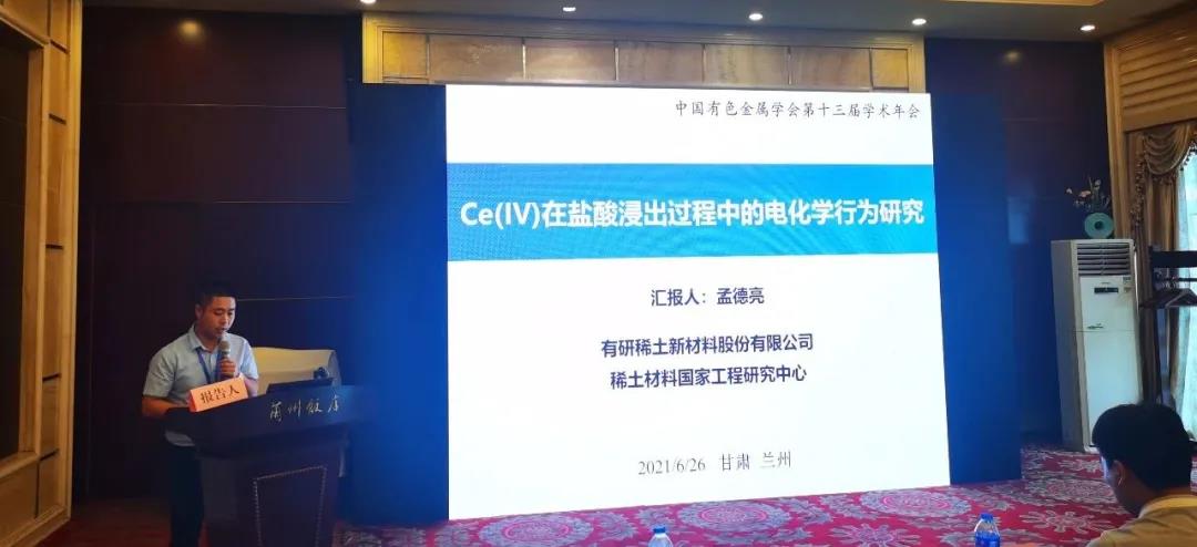 有研稀土李红卫教授做了“稀土材料发展现状分析与展望”的大会主题报告,系统全面阐述了稀土新材料国内外发展现状和趋势。在“稀有稀土金属清洁冶金”分会场,有研稀土王猛博士做了“稀土分离提纯过程物料循环利用技术发展”的特邀报告,展示了有研稀土近年来在稀土绿色冶金技术开发与推广应用方面取得的标志性成果;有研稀土孟德亮博士做了“Ce(IV)在盐酸浸出过程中的电化学行为研究”的报告,独辟蹊径对稀土元素的氧化还原过程的电化学行为进行了基础研究。 中国有色金属学会年会每两年召开一次,是有色金属领域覆盖面最广、学术水平最高的综合性学术盛会。本届年会进一步聚焦有色金属科技前沿和绿色、高质量发展重大战略,开展综合性、高水平学术交流,突出学科交叉、产学研结合、服务产业经济,打造高端学术交流平台,全面提升有色金属行业自主创新能力。来自国内高等院校、科研院所、大型企业的知名专家、学者1500余人参加了会议。孟德亮博士做报告