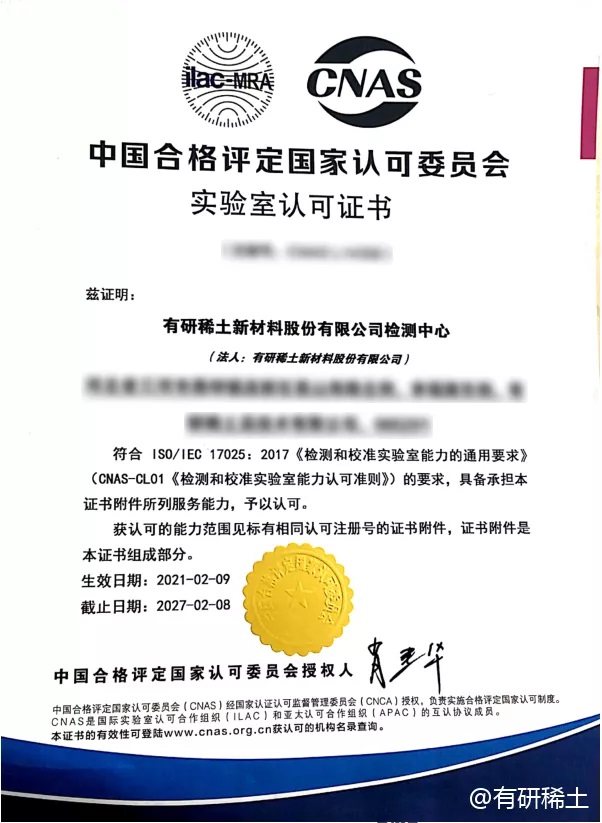 2021年2月9日,有研稀土新材料股份有限公司检测中心正式通过CNAS实验室现场评审和后续考察,成功获得实验室国家认可,一举跻身国家认可实验室行列。本次认可标志着有研稀土检测中心符合了CNAS-CL01:2018《检测和校准实验室能力认可准则》的要求,具备了按照国际认可准则开展检测服务的技术能力。