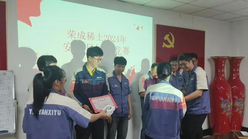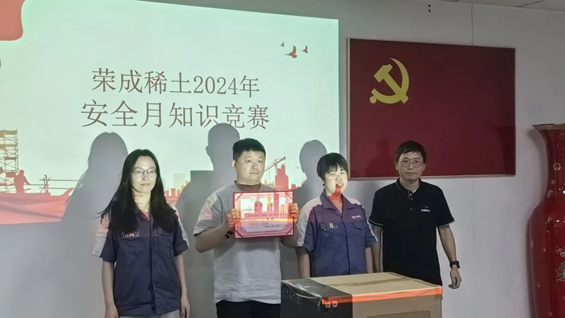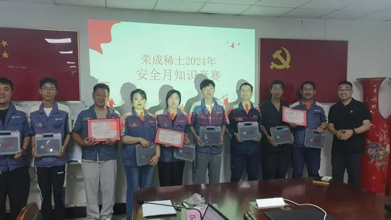 在第23个全国“安全生产月”期间,荣成稀土于2024年6月28日组织了安全知识竞赛活动,紧扣“人人讲安全、个个会应急--畅通生命通道”主题,进一步提升企业员工的安全生产意识,增强应对突发安全事故的能力。荣成稀土党支部书记罗阳出席活动,并为获奖代表队颁奖。
